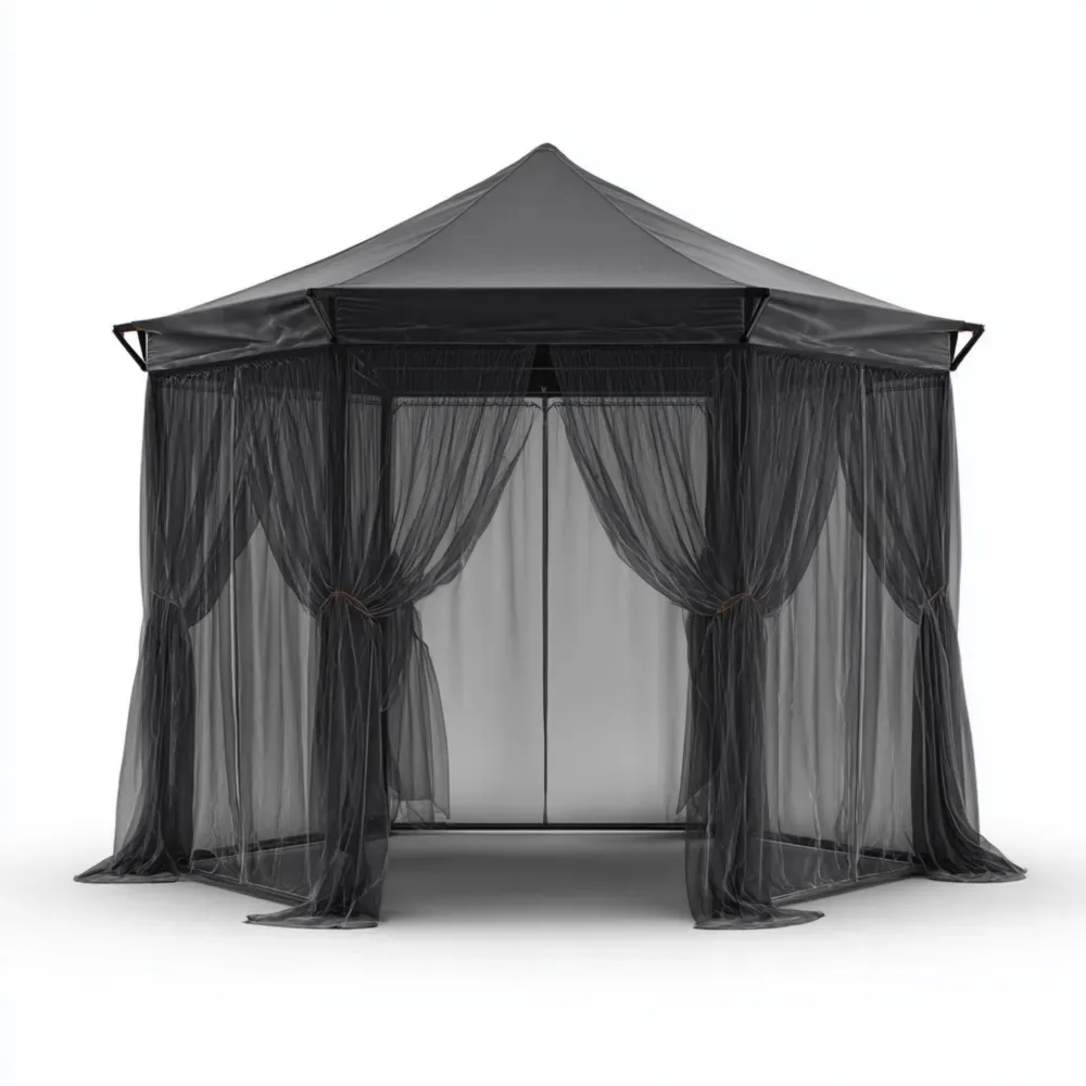 Material y AcabadoEl pabellón está hecho de metal resistente con un techo de poliéster impermeable. Las cortinas de gasa Negra ofrecen privacidad y estilo.